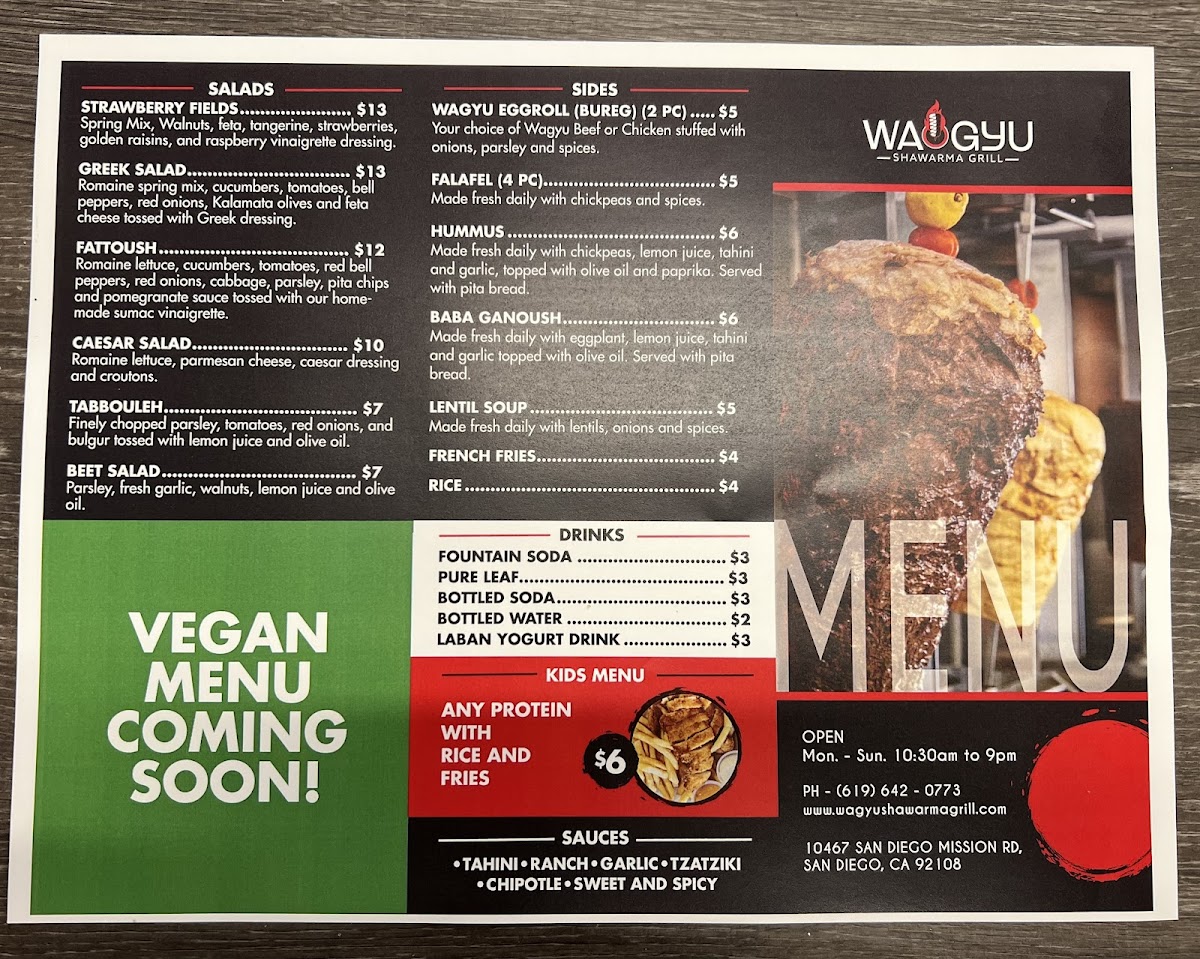 In a bustling dining scene like San Diego’s, Wagyu Shawarma Grill stands out not only for its unique fusion of high-quality Wagyu beef with traditional Mediterranean fare but also as a welcoming spot where every meal feels special. With prices that reflect the quality and portion sizes offered, this hidden gem aims to make great dining accessible and enjoyable for everyone.